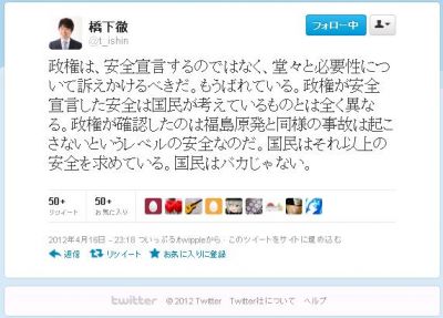 橋下徹大阪市長は、「安全性」を主張し原発再稼働を目指す民主党に対し「安全性」ではなく「必要性」を主張して議論すべきであると指摘している。