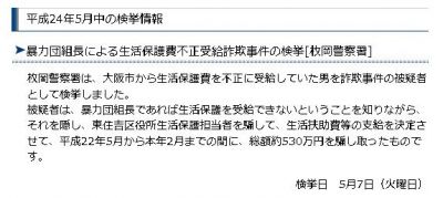 2012年は5月7日に「暴力団組長による生活保護費不正受給詐欺事件の検挙」があった。