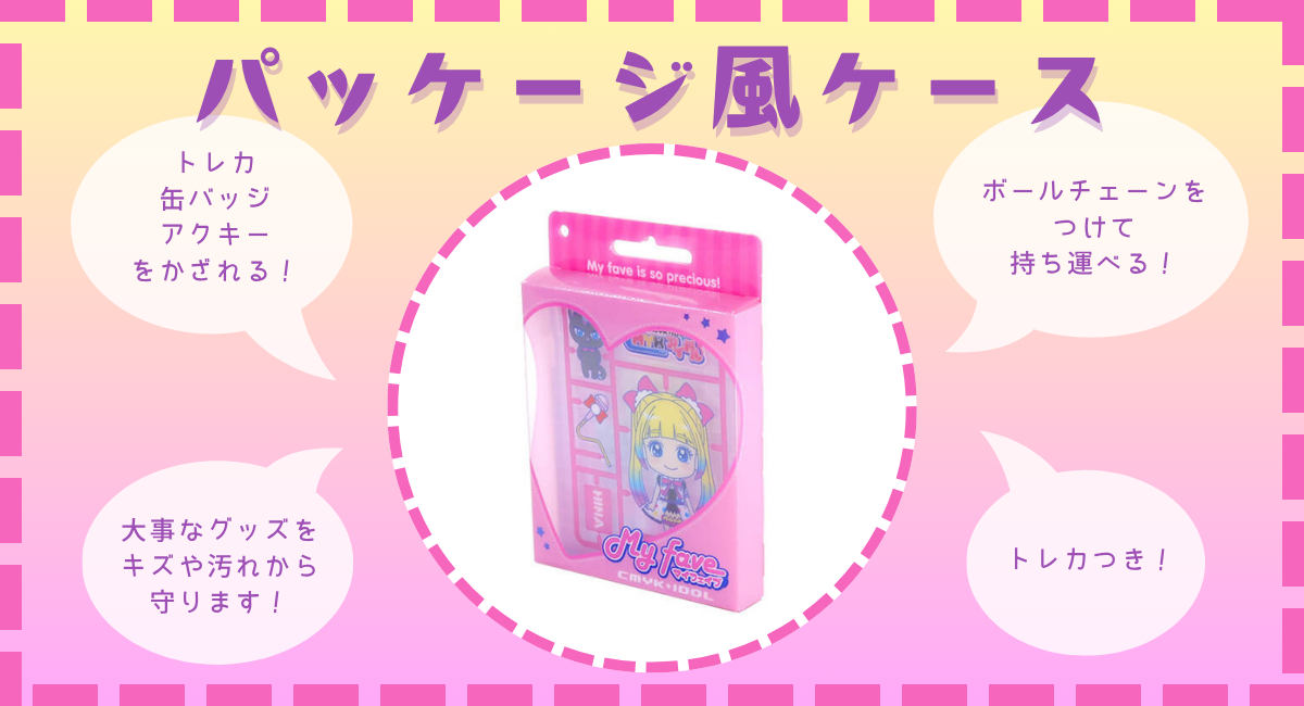 「パッケージ風ケース」は、付属のトレカはもちろん、お手持ちの缶バッジやアクリルキーホルダーなども入るサイズ。お気に入りのグッズをキズや汚れから守りつつ、可愛く飾れるのがポイントだ。