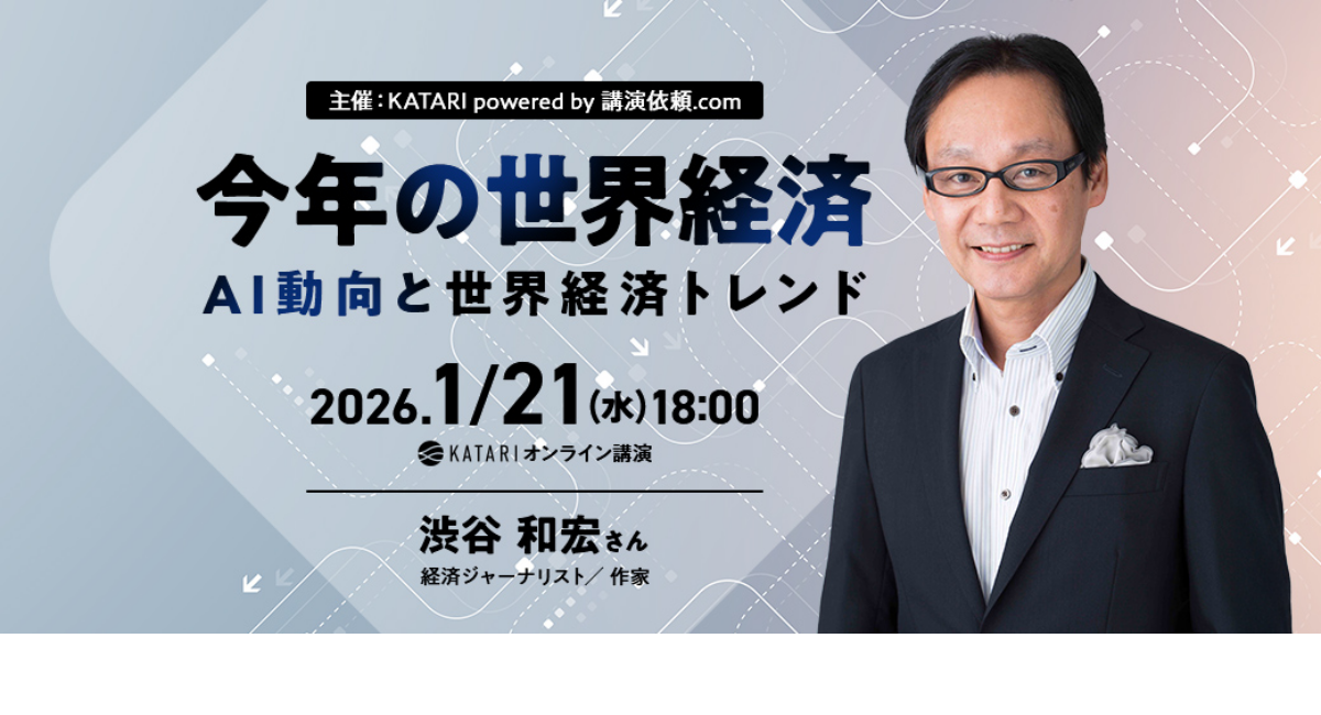 講師紹介業界25年、実績3万6700件以上の講演・講演会の講師情報Webサイト「講演依頼.com」を運営する株式会社ペルソン(本社:東京都千代田区、代表取締役社長 CEO&CINO:渡邊陽一)は、オンライン講演プラットフォーム「KATARI(カタリ)」の第5回オンライン講演として、経済ジャーナリスト/作家の渋谷和弘氏による「今年の世界経済~AI動向と世界経済トレンド~」を、2026年1月21日(水)に開催いたします。