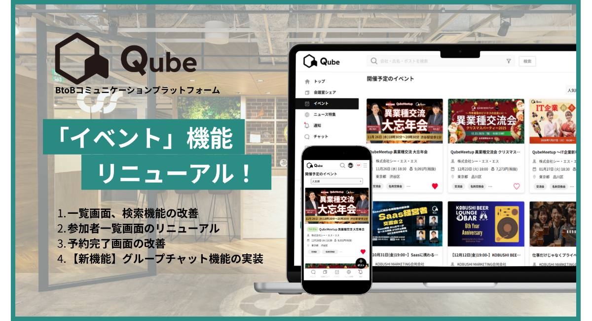株式会社シー・エス・エス(本社:東京都品川区、代表取締役:佐川学)が提供するBtoBコミュニケーションプラットフォーム「Qube」(URL:https://qube-q.com/)は、この度、イベント機能の大幅なリニューアルを実施したことをお知らせいたします。今回のリニューアルにより、イベント参加がビジネスの創出につながるよう、イベントの検索から参加者交流までの一連の体験を、よりスムーズで価値あるものへと進化させました。