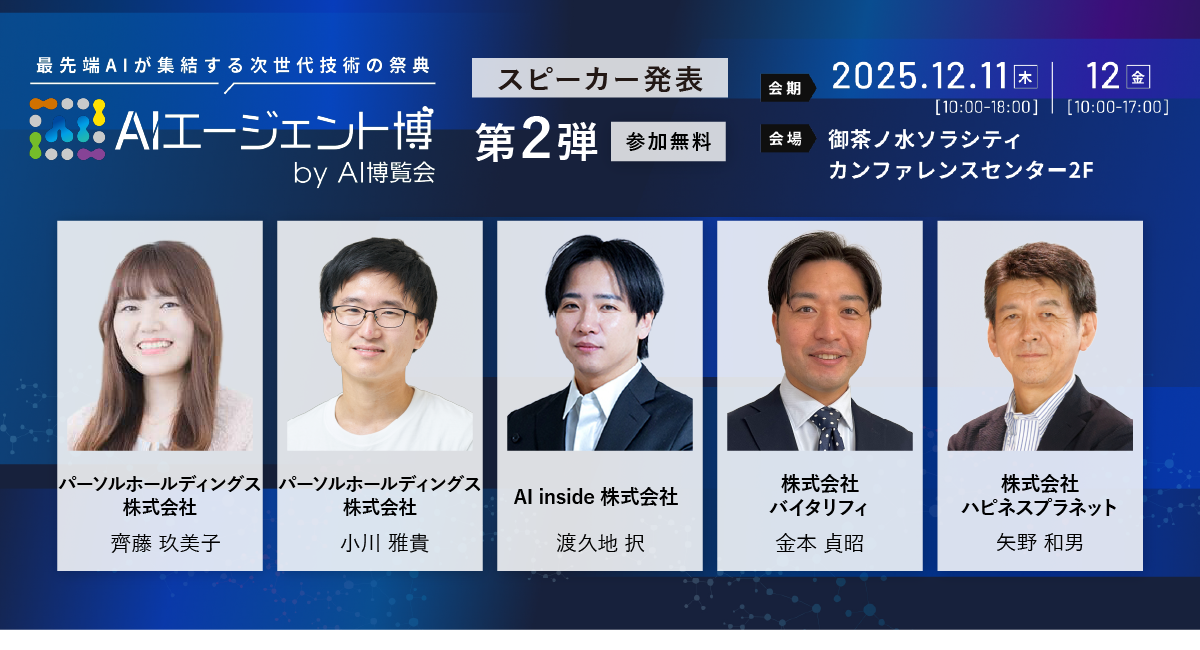 AIポータルメディア「AIsmiley」を運営する株式会社アイスマイリー(東京都渋谷区、代表取締役:板羽 晃司)は、2025年12月11日(木)・12日(金)に「AIエージェント博 by AI博覧会」を開催します。AIエージェント博は、生成AIの次に注目されるAIエージェントに特化し、その実装フェーズの最新トレンドを最短でキャッチアップできる最先端の専門展示会です。次世代AIの主役であるAIエージェントを一気に理解できるよう、業界リーダーや専門家による講演が実施されるほか、厳選された最先端企業や専門家が一堂に会し、展示、講演、デモンストレーションを通じて最前線の知見と具体的なソリューションを提供します。本日カンファレンス第2弾のスピーカー5名を公開しました。業界を牽引するトップランナーたちが語るAIエージェントの未来に、ぜひご参加ください。