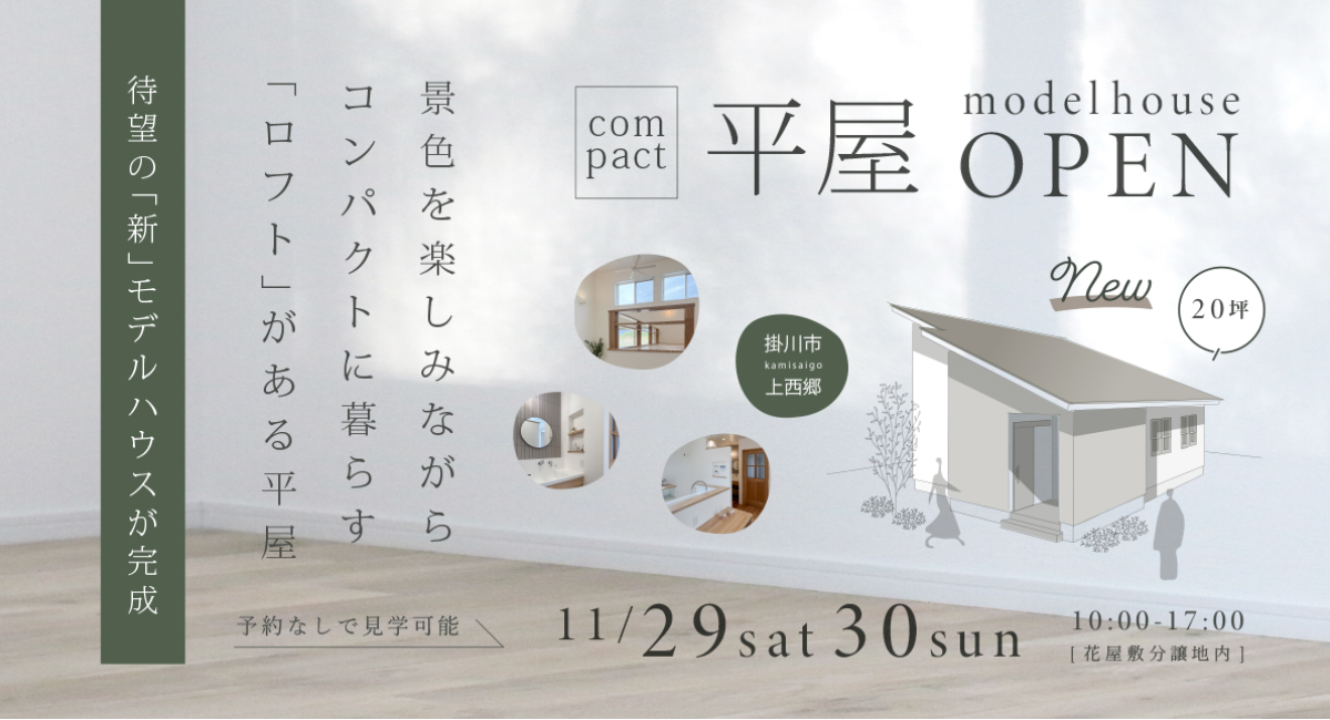 11月29日(土)・30日(日)に静岡県掛川市上西郷の花屋敷分譲地内で実施する完成見学会は、ウィングホーム株式会社が初めて手がける“新しいタイプの平屋”を実際に体験していただけるチャンスです。