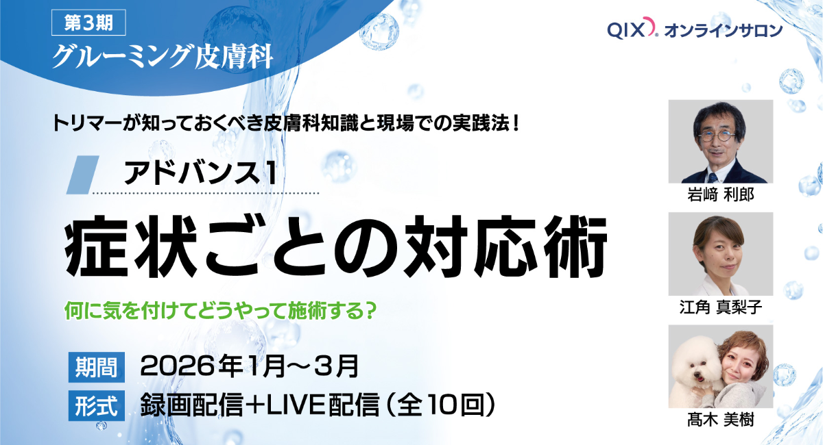 株式会社QIX(所在地:東京都町田市、代表取締役社長:生田目康道)は、オンラインサロン『動物病院トリマーが知っておくべき知識とトリミング術を学ぶ 【第3期】グルーミング皮膚科 ―アドバンス1―』を開催いたします。