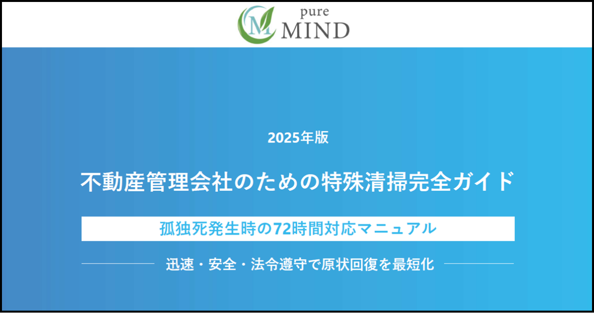 特殊清掃を手掛ける、マインドカンパニー合同会社(所在地:東京都大田区大森東4-11-5、代表社員:鷹田 了)は、【不動産管理会社向け】孤独死対応の決定版ガイド『2025年版 特殊清掃完全ガイド』を、2015年11月9日(日)より自社オウンドメディアから(無料)ダウンロードできます。
