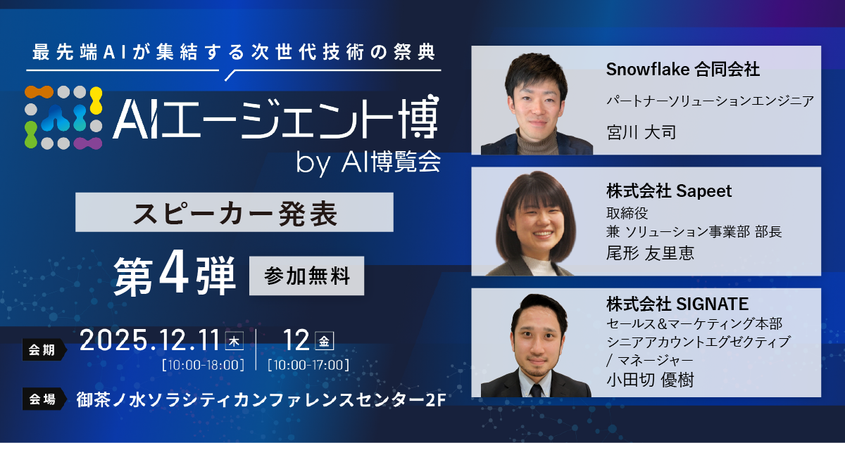 AIポータルメディア「AIsmiley」を運営する株式会社アイスマイリー(東京都渋谷区、代表取締役:板羽 晃司)は、2025年12月11日(木)・12日(金)に「AIエージェント博 by AI博覧会」を開催します。AIエージェント博は、生成AIの次に注目されるAIエージェントに特化し、その実装フェーズの最新トレンドを最短でキャッチアップできる最先端の専門展示会です。次世代AIの主役であるAIエージェントを一気に理解できるよう、業界リーダーや専門家による講演が実施されるほか、厳選された最先端企業や専門家が一堂に会し、展示、講演、デモンストレーションを通じて最前線の知見と具体的なソリューションを提供します。本日カンファレンス第4弾のスピーカー3名を公開しました。業界を牽引するトップランナーたちが語るAIエージェントの未来に、ぜひご参加ください。