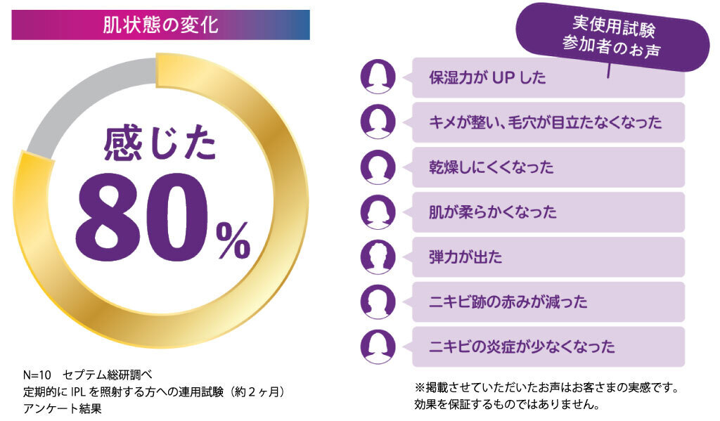 医師による美容治療効果のサポートを目指し、IPL(光治療)後に追加使用することで8割の方が肌状態の変化を実感していることを確認しました。