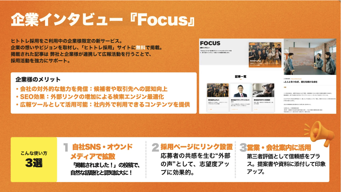 こうした取り組みの結果、『ヒトトレ採用』の導入企業が170社を突破しました。この節目を、より多くの企業の採用競争力向上につなげるべく、採用広報メディア「Focus」を無料で提供することを決定しました。「Focus」で公開された記事は長期にわたり資産として残り続けるため、採用広報・営業・ブランディングの各局面で活用いただけます。