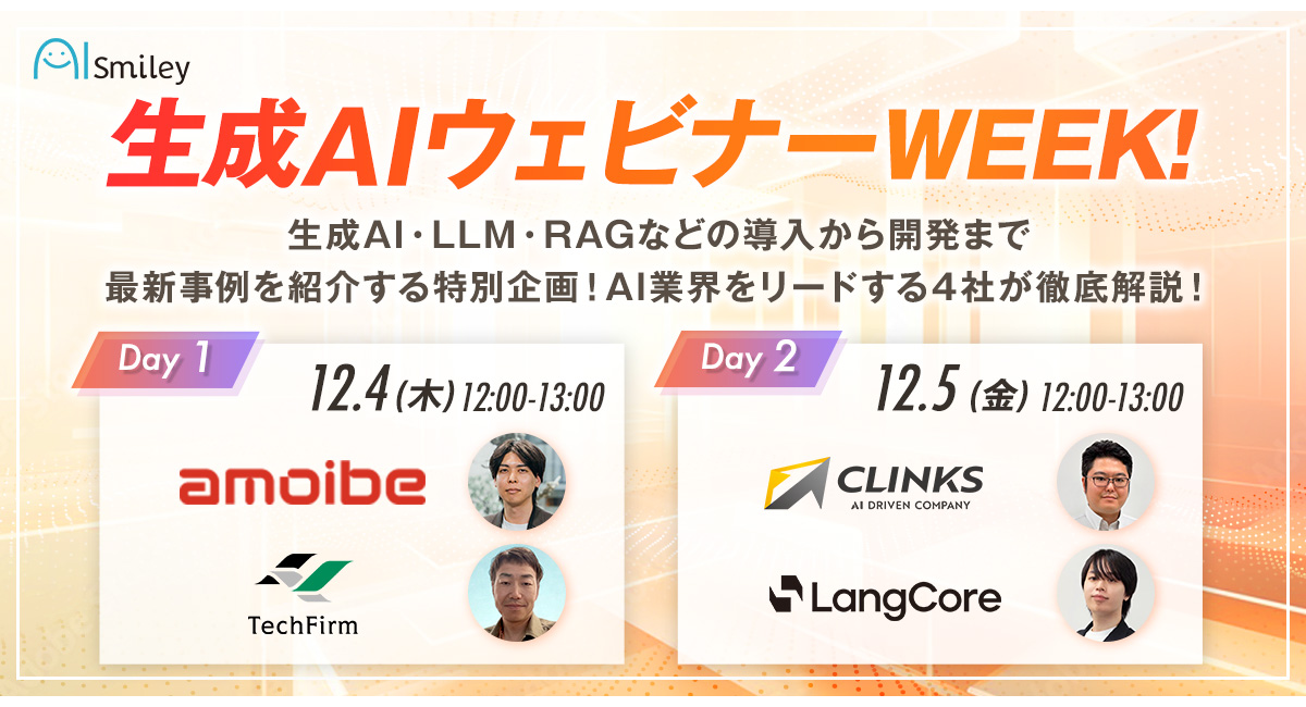 AIポータルメディア「AIsmiley」を運営するアイスマイリー(東京都渋谷区、代表取締役:板羽晃司)は、最先端の生成AI活用に焦点を当てたウェビナーイベント「生成AIウェビナーWEEK!生成AI・LLM・RAGなどの導入から開発まで最新事例を紹介する特別企画!AI業界をリードする4社が徹底解説!」を、2025年12月4日(木)~5日(金)の12時より開催いたします。