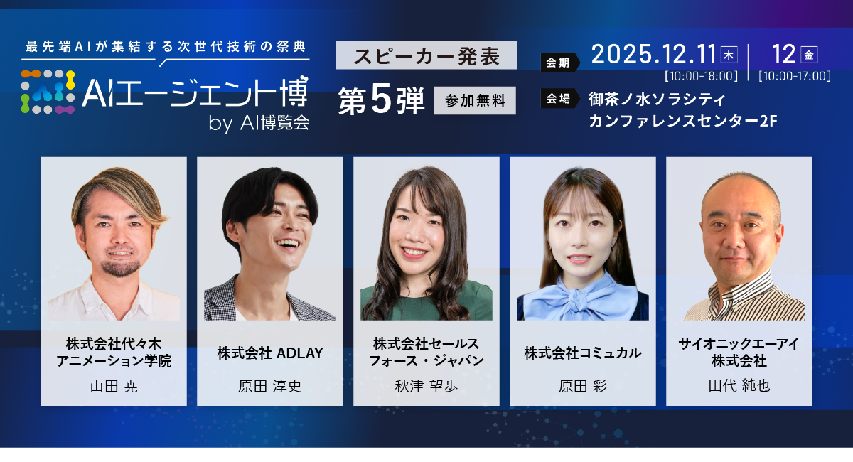 AIポータルメディア「AIsmiley」を運営する株式会社アイスマイリー(東京都渋谷区、代表取締役:板羽 晃司)は、2025年12月11日(木)・12日(金)に「AIエージェント博 by AI博覧会」を開催します。AIエージェント博は、生成AIの次に注目されるAIエージェントに特化し、その実装フェーズの最新トレンドを最短でキャッチアップできる最先端の専門展示会です。次世代AIの主役であるAIエージェントを一気に理解できるよう、業界リーダーや専門家による講演が実施されるほか、厳選された最先端企業や専門家が一堂に会し、展示、講演、デモンストレーションを通じて最前線の知見と具体的なソリューションを提供します。本日カンファレンス第5弾のスピーカー5名を公開しました。業界を牽引するトップランナーたちが語るAIエージェントの未来に、ぜひご参加ください。