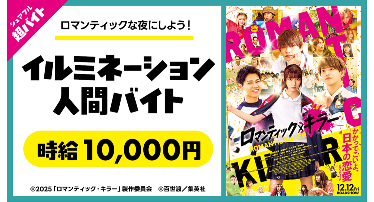 「はたらいて、笑おう。」をビジョンに掲げるパーソルグループのスキマバイトアプリ『シェアフル』やSaaSシフト管理サービス『シェアフルシフト』、就業実績を活用した人材紹介サービス『シェアフルエージェント』などを提供するシェアフル株式会社(本社:東京都港区、代表取締役社長:横井 聡)は、2025年12月1日(月)に都内で行われる超バイト企画、”イルミネーション人間”バイトを募集します。
