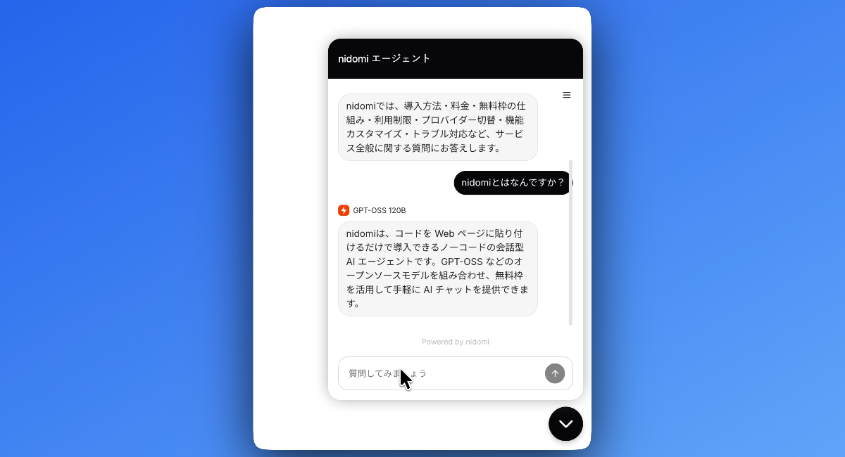 一般的に、gpt-oss 120bはo4-mini(2025年4月16日リリース)相当と言われています。24時間のサポート窓口や、FAQエージェントなどの用途として十分な性能を発揮してくれます。実際に、nidomiのサービスサイトに設置していますので、速さを体感してみください。