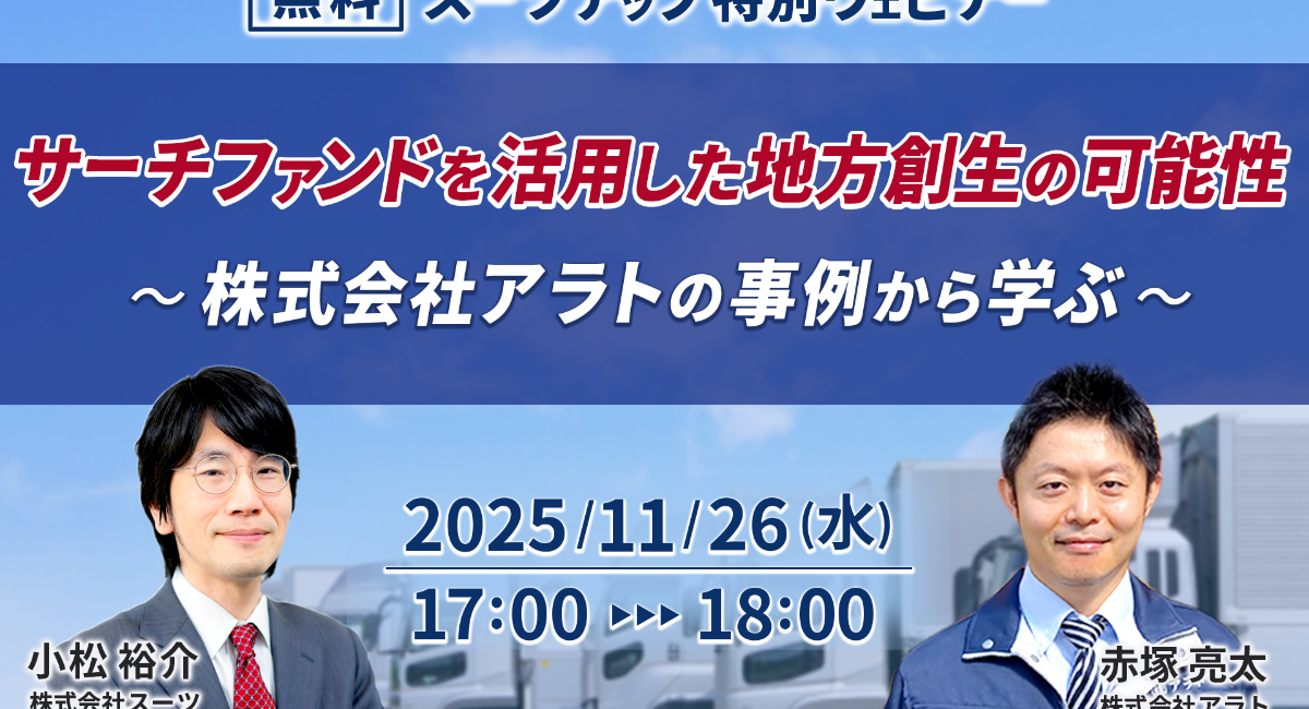 株式会社スーツ(所在地:東京都千代田区、代表取締役社長CEO:小松 裕介)は、2025年11月26日(水)17時から、ゲスト講師に、株式会社アラト 代表取締役社長 赤塚 亮太氏を迎え、第20回となるスーツアップ特別ウェビナー「サーチファンドを活用した地方創生の可能性~ 株式会社アラトの事例から学ぶ ~」を無料開催します。