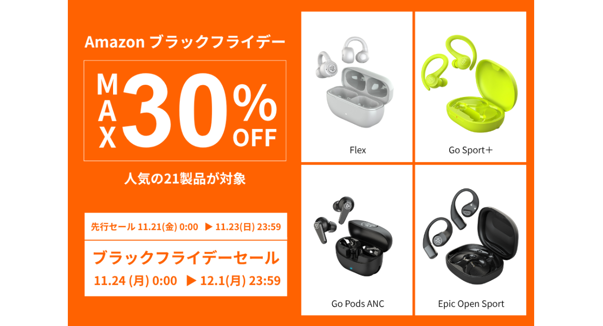 2024年度に100ドル以下のスポーツイヤホンと50ドル以下のワイヤレスイヤホンのカテゴリーで全米売上No.1(※1)を獲得した「JLab」の日本法人、JLab Japan株式会社(本社:東京都港区、代表取締役:横張 亮輔)は、2025年11月21日(金)0:00 ~ 2025年11月23日(日)23:59 まで開催される「Amazonブラックフライデー先行セール」および、2025年11月24日(月)0:00 ~ 2025年12月1日(月)23:59 まで開催される「Amazonブラックフライデー」において、人気のワイヤレスイヤホン・ヘッドホン等、21製品を最大30%OFFにて販売いたします。