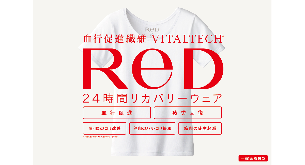 ReD は⾎⾏から毎⽇を元気にする、24 時間リカバリーウェアです。8 つの天然鉱⽯を独⾃配合した⾎⾏促進繊維VITALTECH®が⾝体から放出される遠⾚外線を吸収し、再び肌へ放出することで⾎⾏を促進。「⾎⾏促進」と「疲労回復」という2 ⼤効果で、健康で美しく⽣き⽣きとした⼈⽣=VITAL LIFE を応援します。