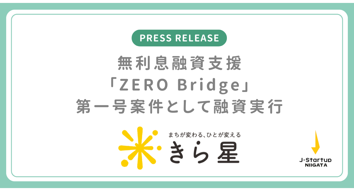 新潟県南魚沼郡のきら星株式会社(代表取締役:伊藤 綾)は、株式会社Wisdom Holdings(新潟県三条市)が運営する、地域経済活性化を目的とした無利息融資支援プログラム「ZeroBridge(ゼロブリッジ)」による第一号案件として、2025年11月25日に200万円の融資を受けました。ZeroBridgeは、金利ゼロで起業家やフリーランサーの挑戦を繋ぐ「架け橋」となることを目指しています。きら星株式会社は、代表の伊藤氏がピッチイベントで優勝した実績と、「地域課題の解決」をビジョンに掲げた地方移住支援を軸とする地域商社としての高い成長性が評価され、本融資の実行に至りました。融資資金は、人材採用の強化と新規拠点展開の初期費用に充当され、「まちが変わる、ひとが変える」をタグラインに、地域商社モデルの確立と地方創生への貢献を加速させます。