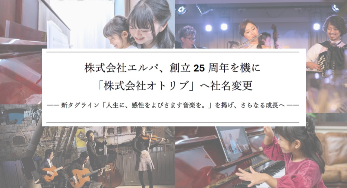株式会社エルパは創立25周年を迎える2025年11月25日に、社名を「株式会社オトリブ(OTOLIV Inc.)」へ変更いたします。新社名は「音」と「生きる」を掛け合わせ、音楽とともに生きる人生への想いを込めています。新タグライン「人生に、感性をよびさます音楽を。」のもと、教育・イベント・マネジメントの3事業を中心に、ウェディングやコンサルティング分野にも取り組みます。また、ロゴデザインやコーポレートサイトを刷新し、ブランドの世界観をより明確にいたしました。社名変更と25周年を記念し、レッスン無料や演奏時間追加などの特別キャンペーンも実施いたします。