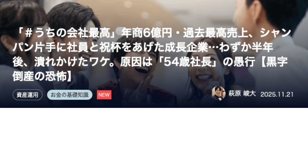 不動産投資のコンサルティング、賃貸・ホテル運営代行を行う株式会社東京財託(所在地:東京都千代田区、代表取締役:萩原峻大)は、この度、代表の萩原峻大が執筆・解説したコラムが、富裕層向け総合情報サイト「幻冬舎ゴールドオンライン」に掲載され、さらに「Yahoo!ニュース」にも転載されたことをお知らせします。掲載されたコラムでは、過去最高の売上を記録した年商6億円の成長企業が、わずか半年後に「黒字倒産」の危機に瀕した実例を紹介。「社員のため」を理由とした3億円の自社ビル購入と過剰な設備投資が、キャッシュフローを急激に悪化させたプロセスをケーススタディとして詳述し、経営における安易な意思決定の危険性と資金繰りの重要性を警鐘しています。