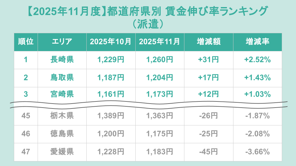 派遣の都道府県別賃金伸び率ランキング(前月比)トップ3は、1位が長崎県(増加額+31円、増加率+2.52%)、2位が鳥取県(増加額+17円、増加率+1.43%)、3位が宮崎県(増加額+12円、増加率+1.03%)でした。