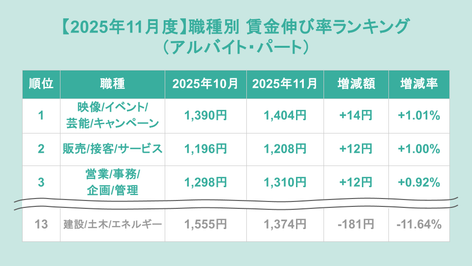 求人サイト主要9媒体から雇用形態別に分析!アルバイト・パートではイベント系が前月比+1.01%で1位【2025年11月度 職種別 賃金伸び率ランキング】