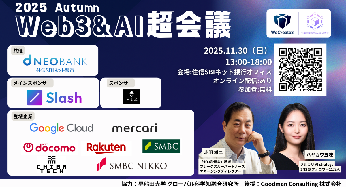 学生団体WeCreate3と千葉工業大学web3研究会は、住信SBIネット銀行と共催で「Web3&AI超会議 2025 秋」を11月30日(日)13:00〜18:00、六本木の住信SBIネット銀行本社とオンラインで開催します。AIとWeb3が加速する時代に20代が取るべきキャリアと金融リテラシーをテーマに、メルカリ、楽天、SMBC日興証券など第一線の企業・専門家が登壇。学生・20代社会人が業界リーダーと直接交流し、自分の進むべき道を考えるきっかけを提供します。メインスポンサーはSlash Vision Labs、スポンサーはVir。特別講演、パネルディスカッション、Q&Aセッション、懇親会を通じて、AI時代の働き方や起業、Web3金融の最前線を学べます。参加無料・事前登録制で、詳細・申込はLumaページから。主な対象は学生および20代社会人で、会場満席時はオンライン視聴が可能です。