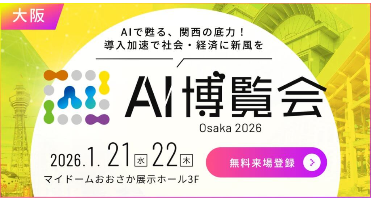 【AI博覧会 Osaka 2026】1/21-22 大阪で開催!~AIで甦る、関西の底力!導入加速で社会・経済に新風を~