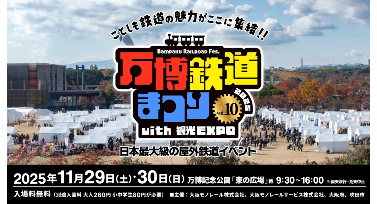 大阪モノレール株式会社(本社:吹田市千里万博公園1-8、代表取締役社長:谷口友英)は、大阪モノレールサービス株式会社、大阪府、吹田市と共催で、2025年11月29日(土)・11月30日(日)の2日間、国内最大級の屋外鉄道イベント「万博鉄道まつり2025 with 観光EXPO」を日本万国博覧会記念公園「東の広場」ほかで開催します。北海道から沖縄まで、全国の鉄道会社等99社・団体、自治体等26団体、バス事業者11社、一般企業13社が出展し、過去最大規模での開催となります。