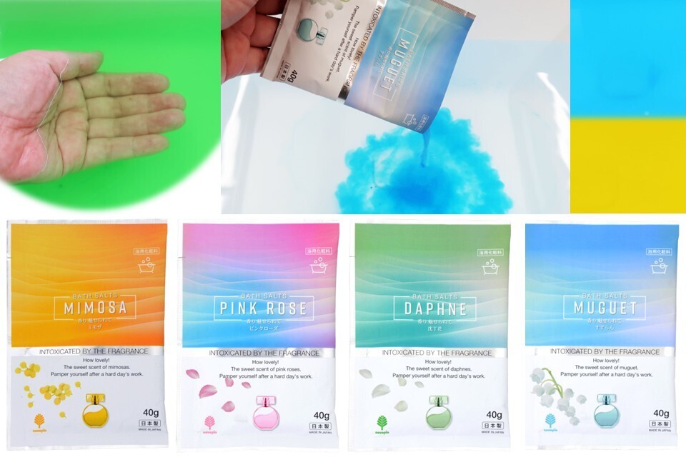粉末分包タイプの浴用化粧料「香り魅せられて」ミモザ、ピンクローズ、沈丁花、すずらん全4種類を新発売します。人気の花4種類をモチーフに、香り豊かなバスパウダーを作りました。素敵な香りに包まれて、心ほどけるバスタイムをお楽しみいただけます。