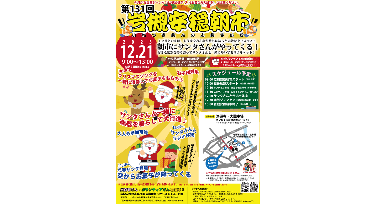 【12/21】第131回岩槻安穏朝市〜朝市にサンタさんがやってくる!〜12月と言えばもうすぐみんなが待ちに待った素敵なクリスマス♪<開催概要>日時 2025年12月21日(日)9:00~13:00会場 浄源寺・大駐車場(埼玉県さいたま市岩槻区太田1-10-44)駐車場 周辺の駐車場を利用(太田小学校隣りに大駐車場あり)協力 嵓月山浄源寺、三春工務店、すぎとSOHOクラブ他