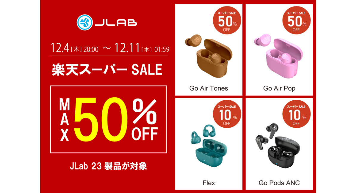 2024年度に100ドル以下のスポーツイヤホンと50ドル以下のワイヤレスイヤホンのカテゴリーで全米売上No.1(※1)を獲得した「JLab」の日本法人、JLab Japan株式会社(本社:東京都港区、代表取締役:横張 亮輔)は、2025年12月4日(木)20:00~2025年12月11日(木)1:59まで楽天市場で開催される「楽天スーパーSALE」において、2025年発売の新製品をはじめとする人気のワイヤレスイヤホン・ヘッドホンなど、23製品を最大50%OFFで販売いたします。
