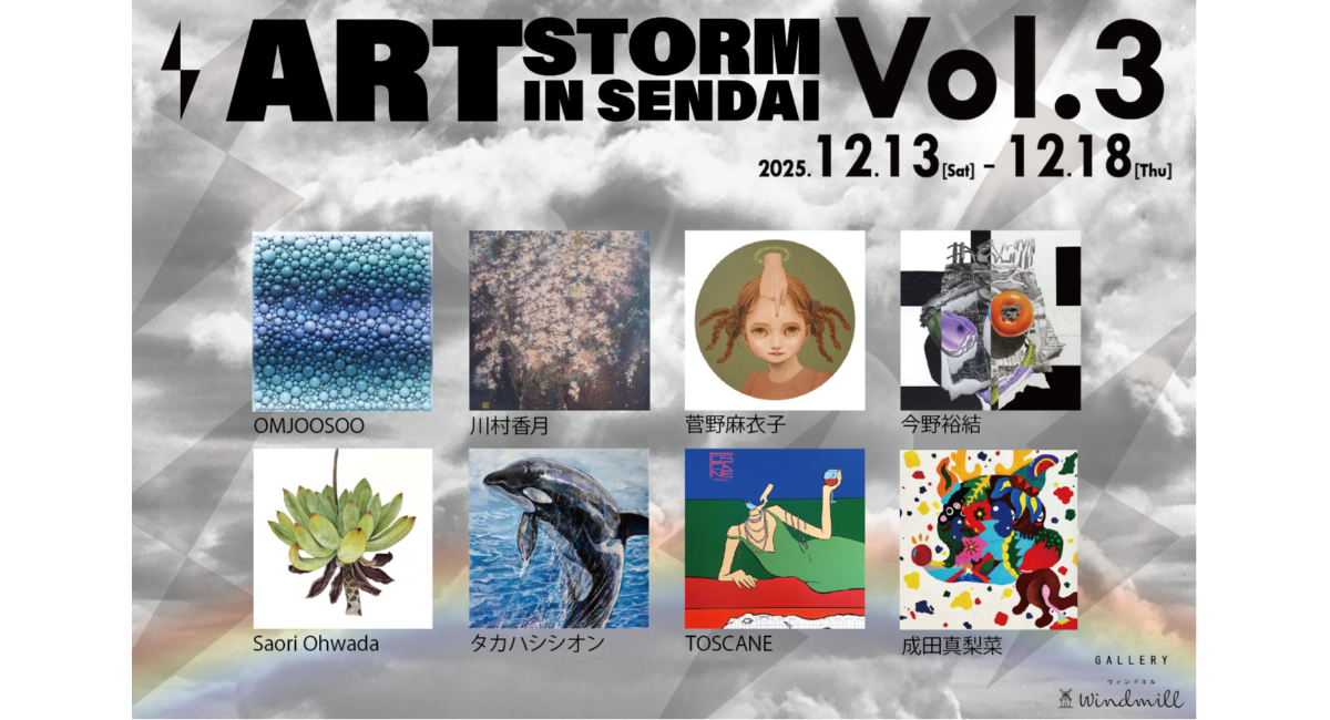 仙台市のアートギャラリーGallery Windmill(ギャラリーウィンドミル)では、年間2回開催の基幹アートグループ展「Art Storm in Sendai」の第3回展を、2025年12月13日(土)から18日(木)まで開催します。東北に縁を持ち、国内外で活躍するアーティスト8名の多彩な表現が一堂に会し、平面・立体・半立体まで“いま”のアートシーンを一望できる構成です(入場無料)。