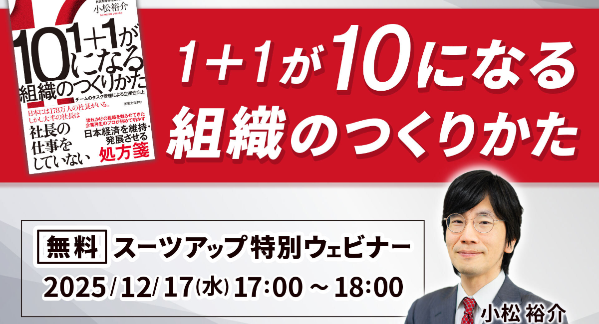 株式会社スーツ(所在地:東京都千代田区、代表取締役社長CEO:小松 裕介)は、2025年12月17日(水)17時から、当社代表取締役社長CEO 小松 裕介による、2025年最後の開催となる第21回スーツアップ特別ウェビナー「1+1が10になる組織のつくりかた」を無料開催します。