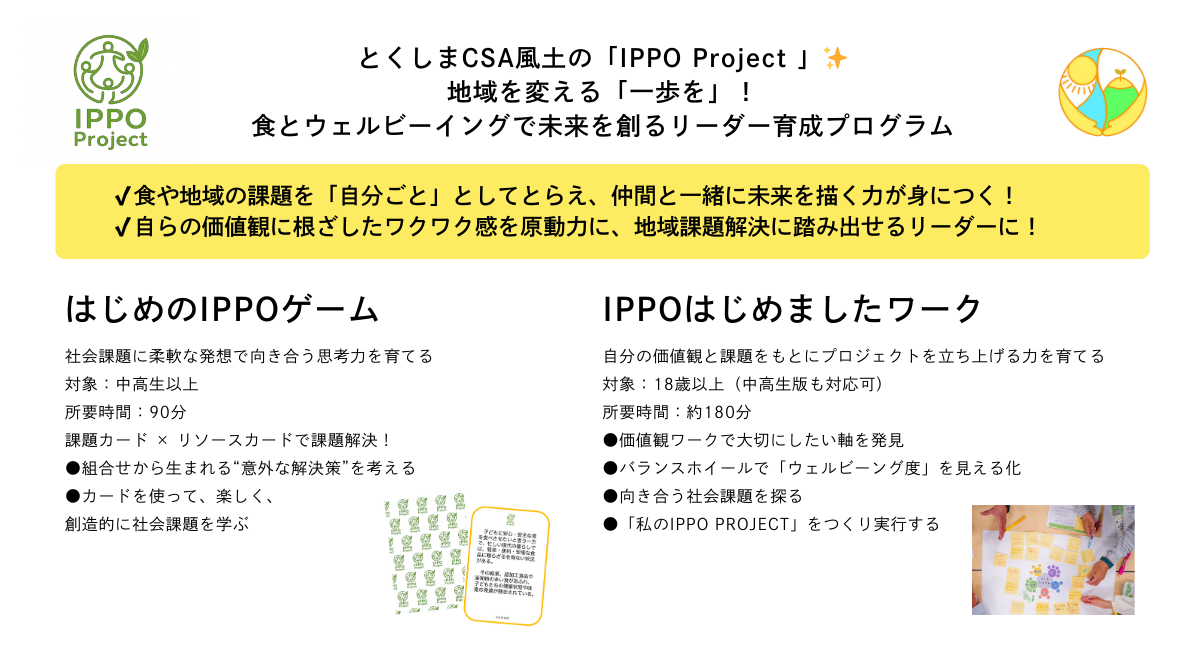 一般社団法人とくしまCSA風土(徳島県小松島市、代表理事:金村真友子)は、2025年12月10日(水)、地域の風土・文化を活かした循環型で持続可能なフードシステム(※1)を構築し、地域コミュニティ全体のウェルビーング向上を目指す取り組み「IPPO Project(イッポ・プロジェクト)」を開始いたしました。「IPPO(イッポ)」という名称には、地域の未来をよりよくするために、一人ひとりが「一歩」を踏み出すという思いが込められています。 開始に伴いプロジェクトの第一弾企画として、「食とウェルビーング」をテーマに、地域コミュニティが抱える複雑な課題に向き合い、解決に向けて行動できるリーダーを育成する研修プログラム「はじめのIPPOゲーム」および「IPPOはじめましたワーク」のモニター募集を開始いたします。