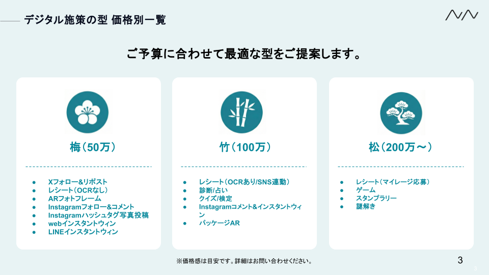本カタログでは、50万円から実施可能な手軽な施策から、200万円以上の没入型コンテンツまでを、分かりやすく「松・竹・梅」の3プランに整理。