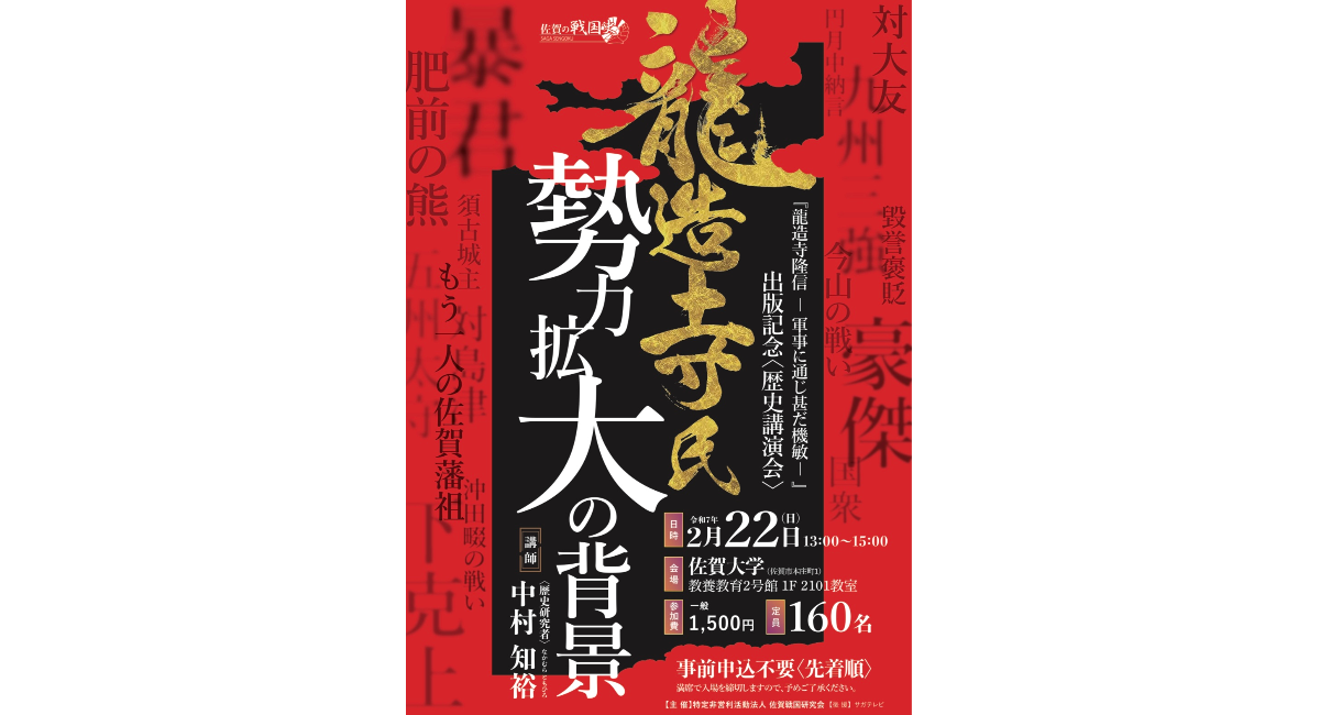 <最新研究により変化した、龍造寺隆信の人物像>★『龍造寺隆信 -軍事に通じ甚だ機敏 -』出版記念講演会「龍造寺氏勢力拡大の背景」■講師:中村知裕(歴史研究者)■日時:2026年2/22(日)13:00~15:00 ■会場:佐賀大学 教養教育2号館 1F 2101教室 ■後援:サガテレビ ■参加費:1500円 ★定員160名程)