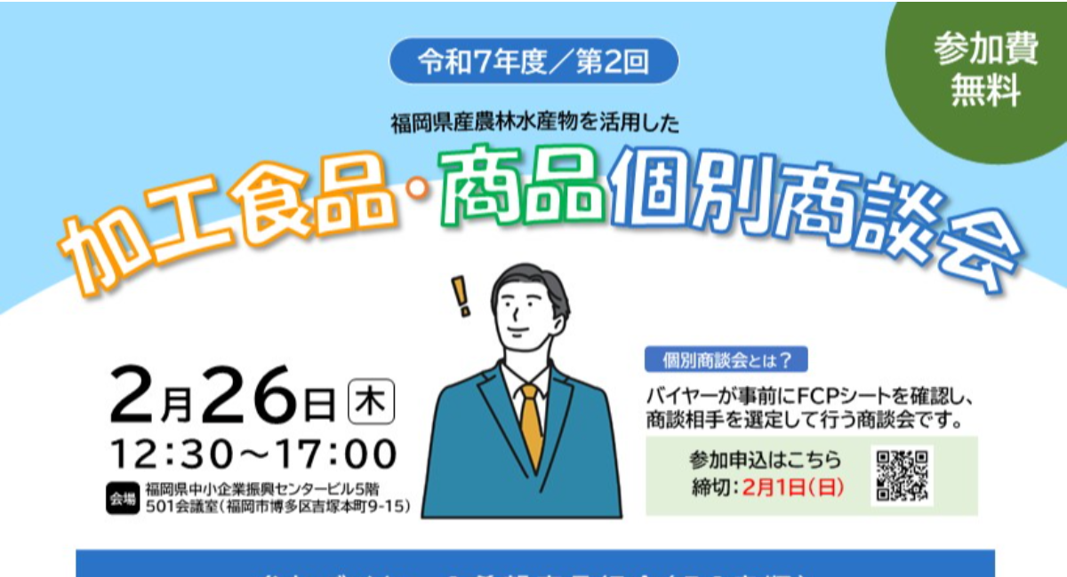 福岡県産の農林水産物を活用した商品の商談会を令和8年2月26日(木)に開催します。事前に福岡県内の優良バイヤーが商品情報を確認するので、スムーズな商談で成約率UPが期待できます!