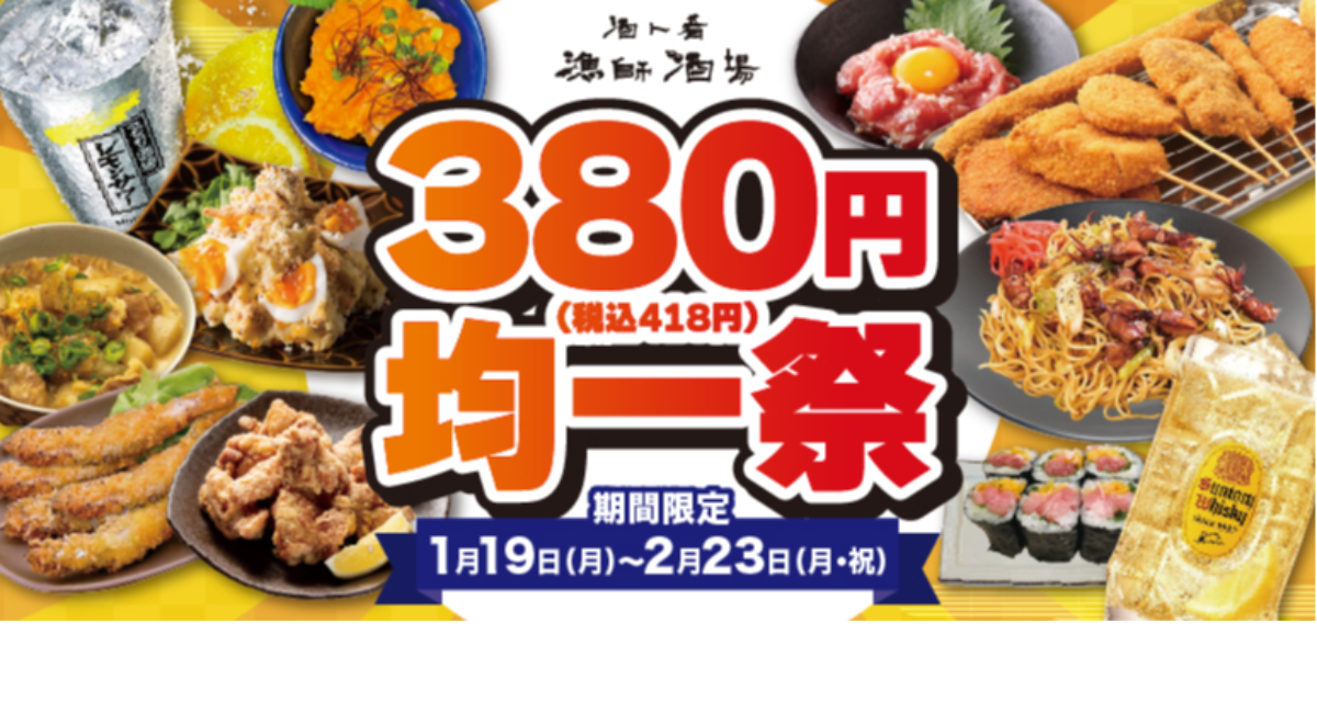 酒ト肴 漁師酒場では、2026年1月19日(月)から2月23日(月・祝)までの期間限定「380円均一祭」を開催いたします。