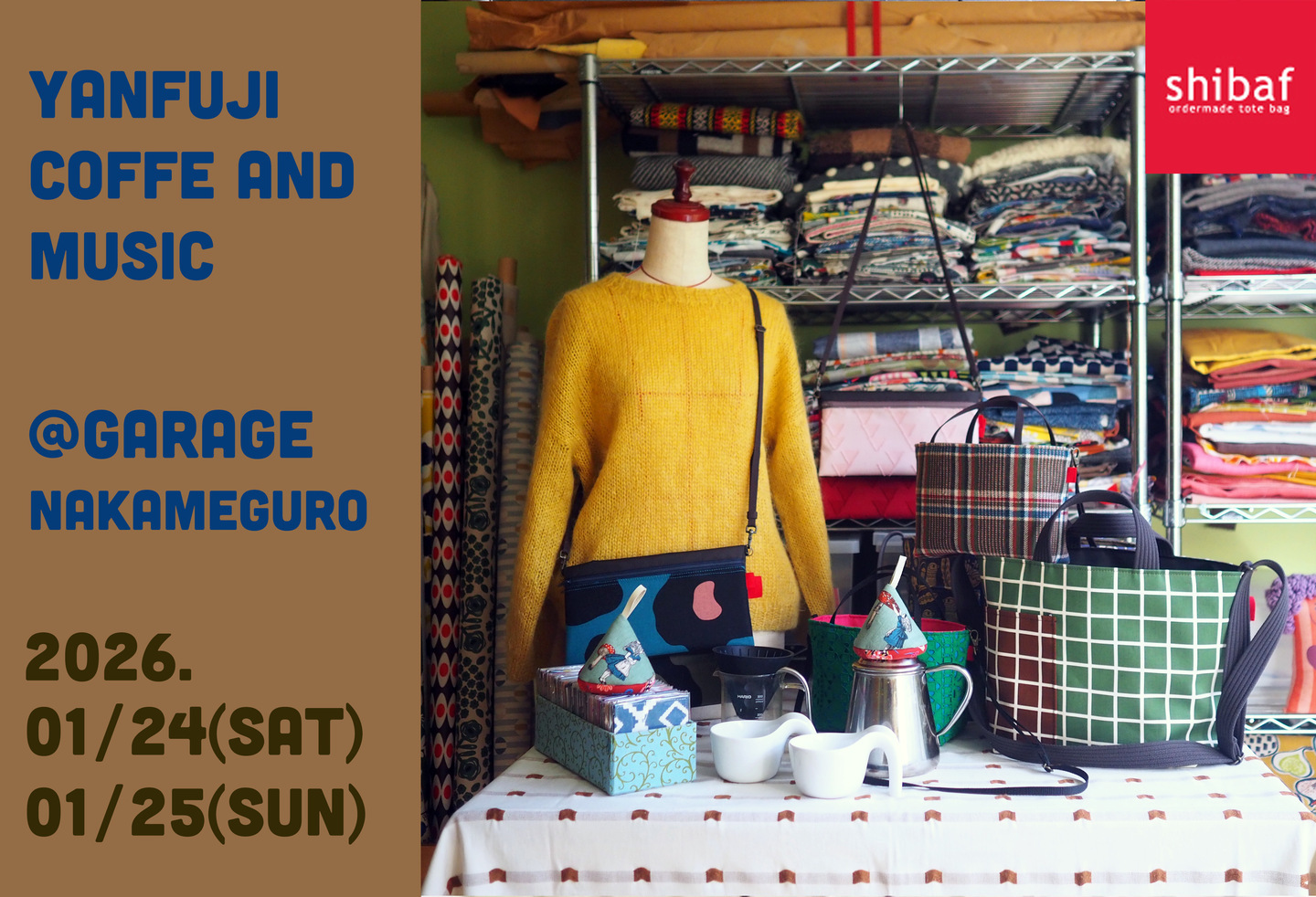 Cafe Apresmidiで開催されているFriday Loungeで毎月レコードを廻しているヤンフジ氏が主催するイベント。ヤンフジ氏が自家焙煎にハマり自ら焙煎した珈琲豆をハンドドリップで提供してくれる。ヤンフジ氏以外にもゲストdjが参加予定だ。「YANFUJI COOFFEE & MUSIC」では毎回、展示や物販が楽しめる。今回は珈琲にまつわる小物達と冬らしくハンドニットのセーターの展示販売が予定されている。場所は中目黒駅から徒歩5分で、靴の修理や、器の修理を手掛けているアトリエのようなお店だ。教えたくはないけど、自慢したい隠れ家。