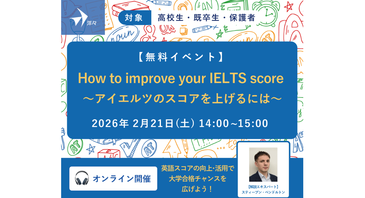 総合型選抜(AO入試・推薦入試)・小論文の個別指導を手がける洋々(本社所在地:東京都渋谷区)は、2026年2月21日(土)に無料イベント「洋々エキスパートが解説!How to improve your IELTS score~アイエルツのスコアを上げるには~」をオンライン開催します。