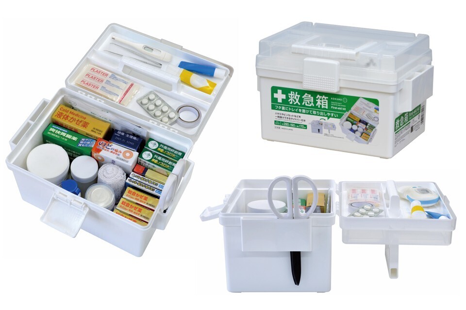 「救急箱」新発売。ボックス+トレイで薬や救急道具を2段収納。サッと運べて取り出しやすい。