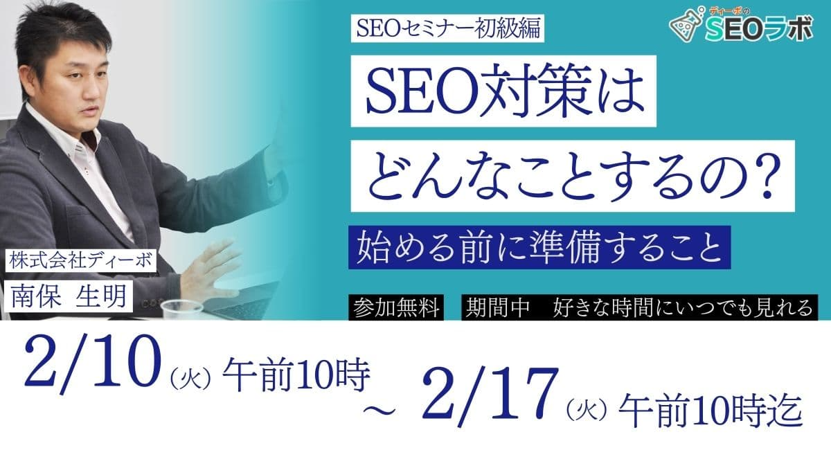 SEO対策サービスの開発・販売を行っている株式会社ディーボ(札幌市、代表取締役社長:藤沢 竜志、以下:ディーボ)は、2026年2月10日(火)午前10時~2月17日(火)午前10時まで視聴可能な配信型のSEO対策セミナーを開催いたします。