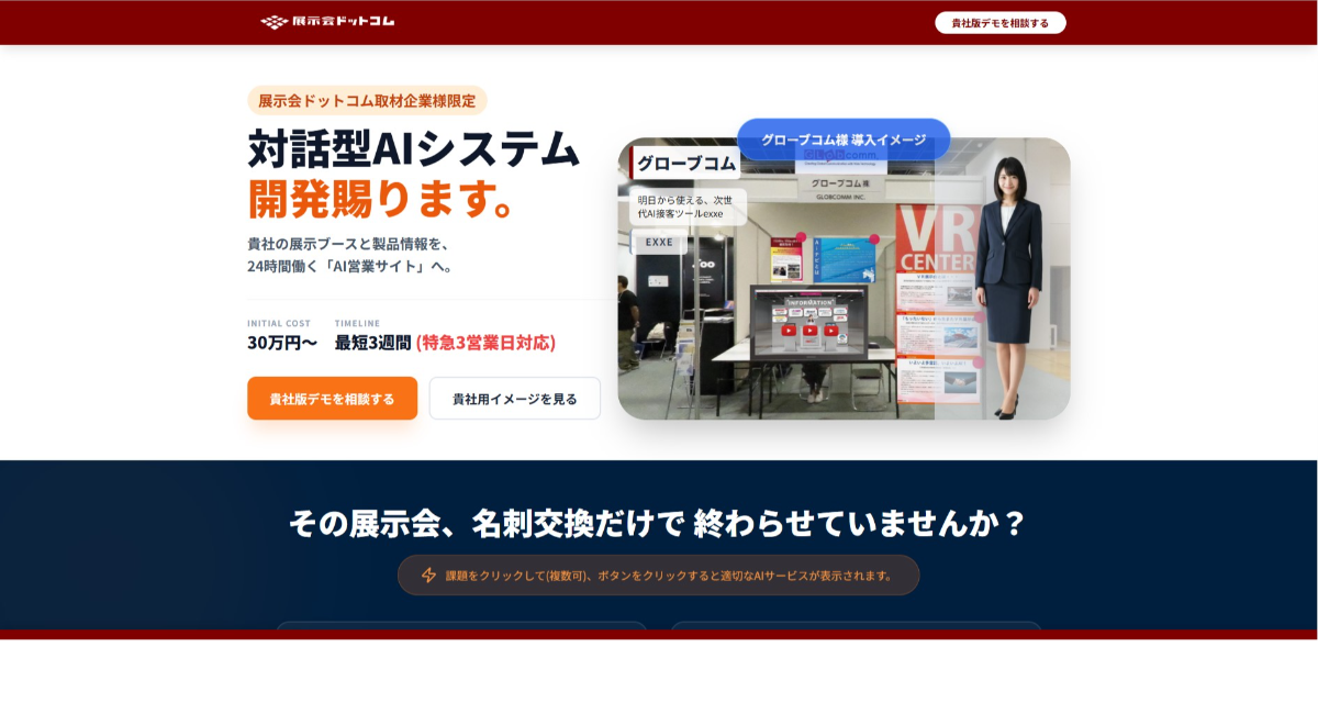 貴社の展示ブースと製品情報を、24時間働く「AI営業サイト」へ。初期費用30万円〜・最短3週間で導入可能