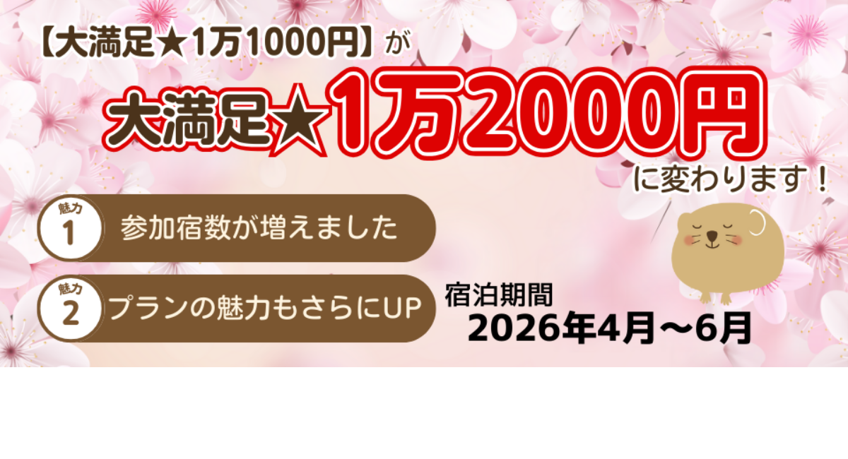 北海道に特化した宿泊予約サイト「ぐうたび北海道」(運営:北海道バリュースコープ株式会社/札幌市中央区、代表取締役社長:三浦重道)は、当サイトの人気宿泊プラン「大満足★1万1000円」について、2026年4月のご宿泊受付分より、プラン価格を改定し、「大満足★1万2000円」としてリニューアルいたします。予約受付は、2月20日(金)より開始いたします。