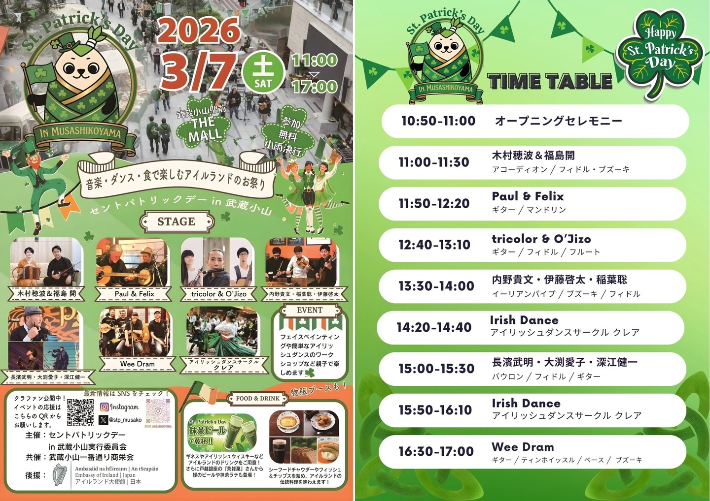 2026年3月7日(土)、武蔵小山駅前広場 THE MALLにて開催するアイルランド文化イベント「セントパトリックデー in 武蔵小山」の公式チラシ、ステージタイムテーブルおよびオリジナルTシャツデザインが完成いたしました。本イベントは、音楽・ダンス・食を通してアイルランド文化を体験できる地域参加型フェスティバルです。武蔵小山駅前の「The Mall」広場を会場に、商店街とも連携し音楽ステージやダンスパフォーマンス、本場のフードとドリンク企画を予定しており、子どもから大人まで幅広い層が楽しめる一日を創り上げます。