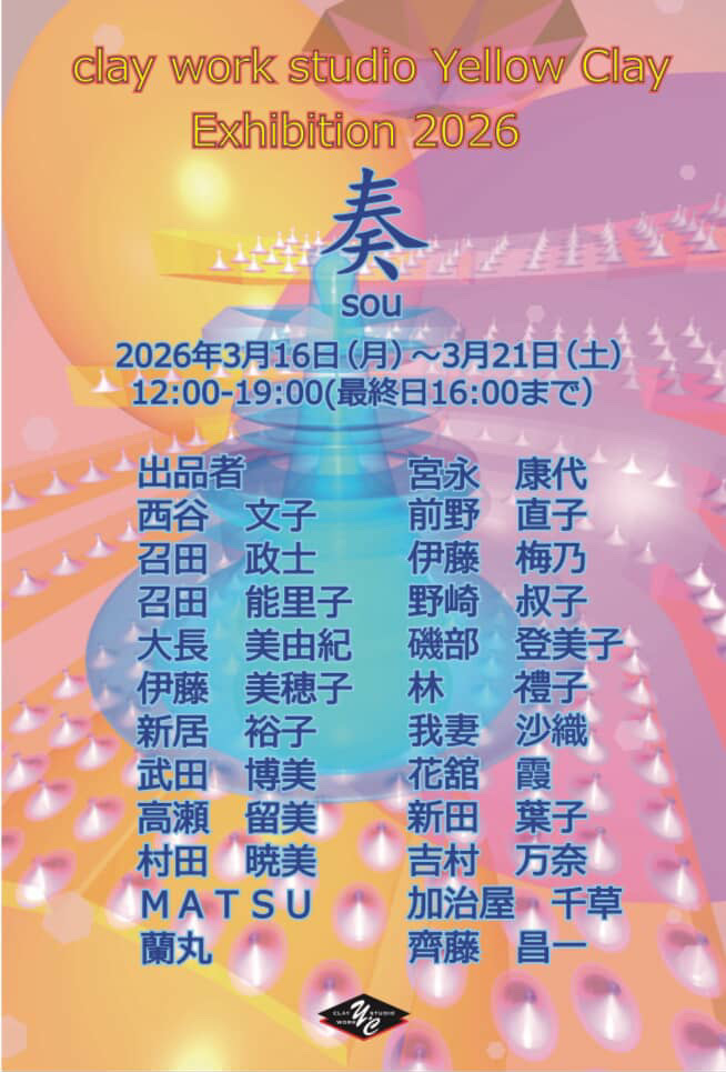 東京・恵比寿の会員制陶芸スタジオ「イエロークレイ」(東京都渋谷区、FAD:齊藤昌一)は、第24回作品展「奏(そう)」を、2026年3月16日(月)から21日(土)まで、銀座のGalleryうえすと(東京都中央区)にて開催します。スタジオ会員によるさまざまな表現の陶芸作品が一堂に会し、ひとりひとりの手から生まれた「形」が重なることで、空間全体がひとつの「響き」を奏でる展覧会を目指します。入場は無料です。また、3月20日(金・祝)には主宰・齊藤昌一によるライブ演奏とミニパーティも開催予定です。