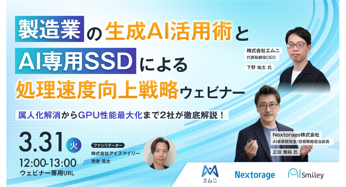 国内最大級のAIポータルメディア「AIsmiley」を運営する株式会社アイスマイリー(東京都渋谷区、代表取締役:板羽晃司)は、2026年3月31日(火)12時から製造業AI活用ウェビナーを開催します。