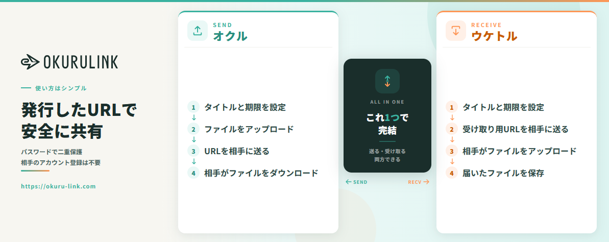 3. 受信側の負担をゼロにする「アカウントレス設計」 ファイルの受け取りやアップロードを行う受信者は、アカウント登録やログインの必要がありません。