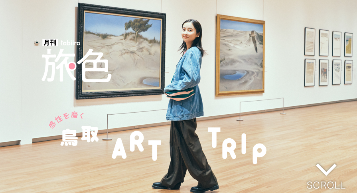 少女のような透明感や瑞々しさはそのままに、自信や経験に裏付けられた余裕も感じられ、大人と子どもの感性が重なり合う独自の存在感を纏っている堀田真由さん。「普段から美術館へ行くことが多いので、アートをテーマに鳥取を巡ることができると聞いてとても楽しみにしていました」と、アート旅に興味津々。「鳥取県立美術館」では、「展示室の広さや静けさが好き」と、空間そのものを楽しんでいたり、触覚で楽しむ彫刻作品に触れてみたり、作品情報を真剣に読む姿も。工業団地にあった工場とサイロ建物をリノベーションしたギャラリー「アート格納庫M」では、廃油と水で満たされた2つのプールからなる「Oil and Water」を鑑賞しながら、「吸い込まれるような感覚」と不思議な体験だったことを語ります。ご自身のプライベートの旅について伺うと、「30代に入る前に、素敵な思い出や言葉を自分に贈れるように、29歳のタイミングで記念の旅をしようと友人と話しています」と、教えてくれました。