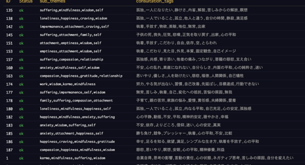 しかし、これまで偈句の85%以上にテーマ分類タグが設定されておらず、テーマタグを持たない偈句がどのような相談にもマッチしてしまう状態でした。その結果、ごく一部の汎用的な偈句が繰り返し引用される偏りが発生していました。