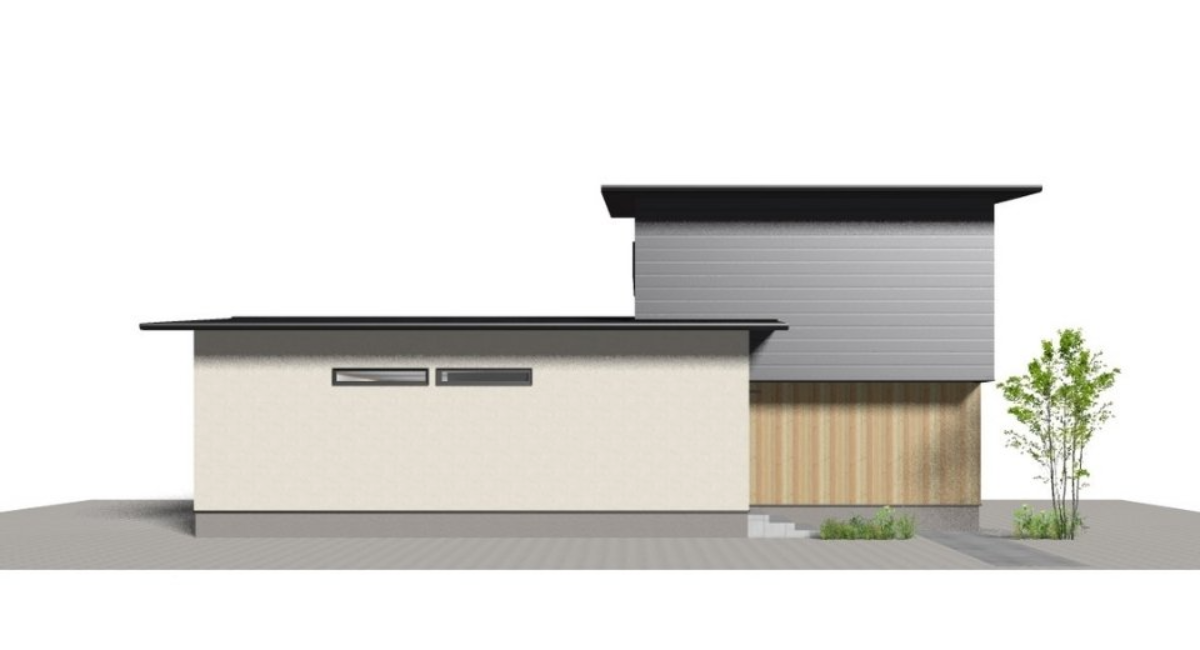 ガルバリウム鋼板・塗り壁・木材を組み合わせ、重厚感と温かみ、デザイン性をバランスよく表現。